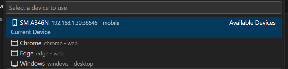 ctrl + shift + p 로 Android adb wlan show devices를 선택해서 현재 연결된 디바이스 목록을 확인 할 수 있습니다.